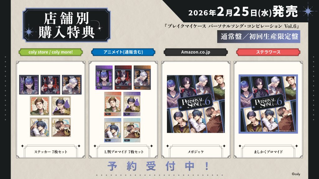 豪華封入特典アイテムが付属するほか、歌唱キャストによるコメント音源も収録。さらに、『ブレイクマイケース パーソナルソング・コンピレーション Vol.6』初回生産限定盤と『ブレイクマイケース パーソナルソング Vol.4~6 コンプリートBOX』各形態には『ブレイクマイケース 4th Conference』最速先行抽選券を封入いたします。そのほか、ご予約ショップに応じて素敵な店舗別特典も。